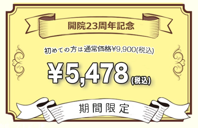 初めての方が、当院の施術を体験して頂きやすくするために特別価格を設けました。通常、初検料(2,200円)+施術料(7,700円)=9,900円(税込)のところを初検料0円サービス+本格一般コースの施療料を5,478円(税込)で、ご提供です。